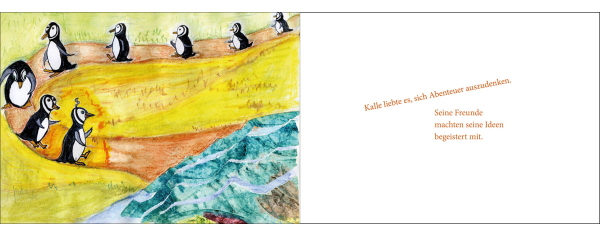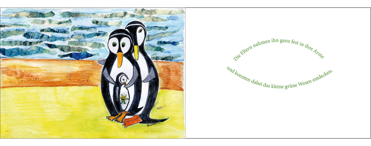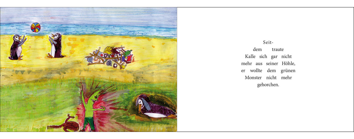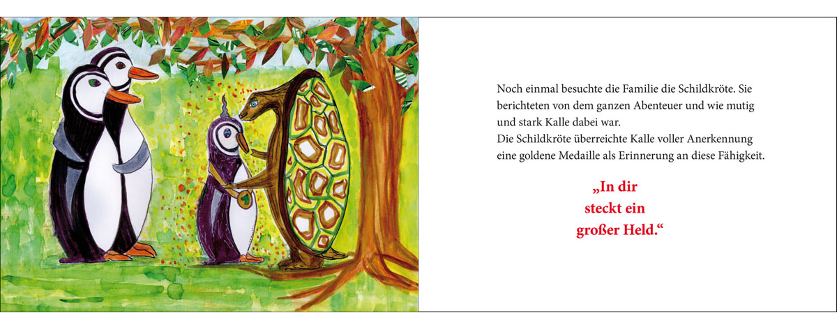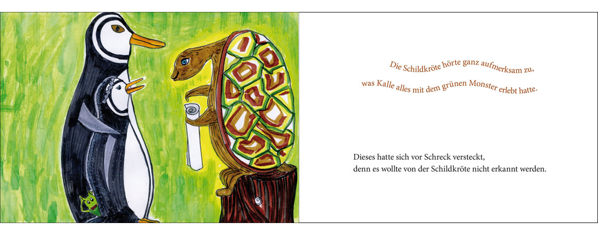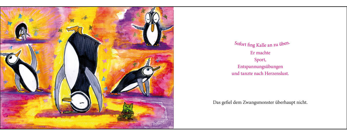 Die Geschichte des Pinguinkindes Kalle beschreibt das Entstehen einer Zwangsstörung. Aus einem vergleichsweise kleinen Anlass gerät das Pinguinkind aus dem inneren Gleichgewicht. Es entsteht eine Zwangsstörung, die sich rasch verselbständigt und die Lebenswirklichkeit des Pinguinjungen bestimmt und beeinträchtigt. Hilfe bekommt Kalle zunächst durch seine Eltern, an die er sich vertrauensvoll wenden kann. Später erfährt er Hilfe durch eine weise Schildkröte, die als Psychotherapeutin gelesen werden kann. Mit dieser Unterstützung gelingt es Kalle, das Zwangsmonster zu besiegen und sein Leben wieder freudig zu leben. Im Laufe des Bewältigungsprozesses entwickelt er sich zum Kämpfer in eigener Sache und erlebt seine Selbstwirksamkeit.