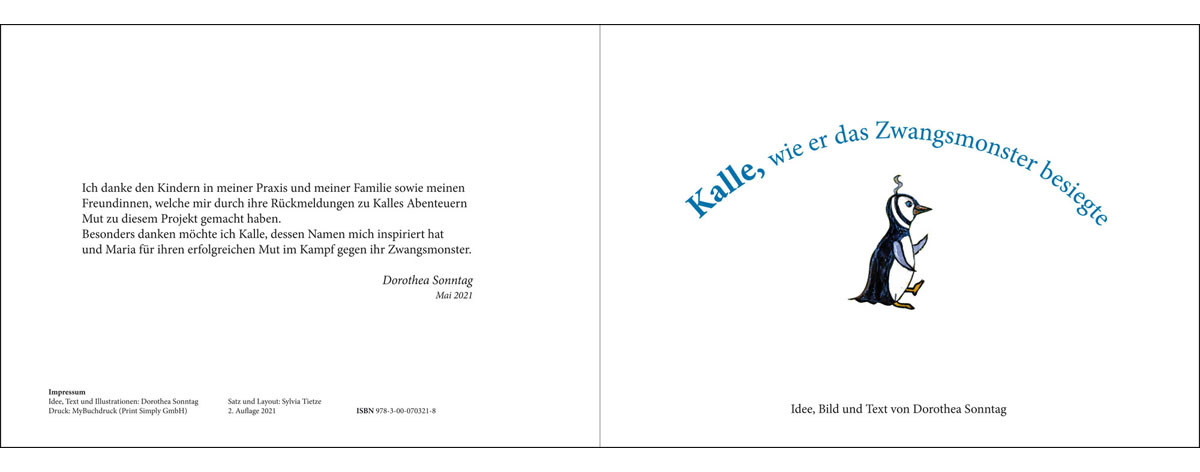 Die Kunsttherapeutin Dorothea Sonntag verfügt über einen großen Erfahrungsschatz im Umgang mit Zwangsstörungen. Eine kurze Einführung am Anfang des Buches gibt erwachsenen Bezugspersonen Hinweise auf die Anwendung der Geschichte im Rahmen einer Expositionstherapie. Die Heldenreise des Pinguinjungen Kalle kann durch die klaren und freundlichen Illustrationen nachvollzogen werden.